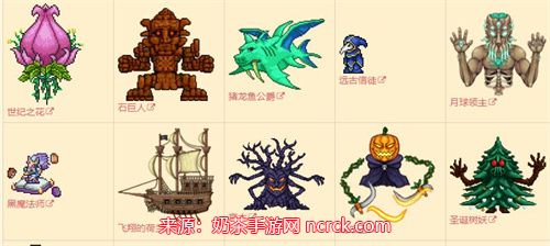 三、事件Boss:黑暗魔法师、食人魔、双足翼龙、荷兰飞盗船、哀木、南瓜王、常绿尖叫怪、圣诞坦克、冰雪女王、火星飞碟、日耀柱、星云柱、星旋柱、星尘柱。