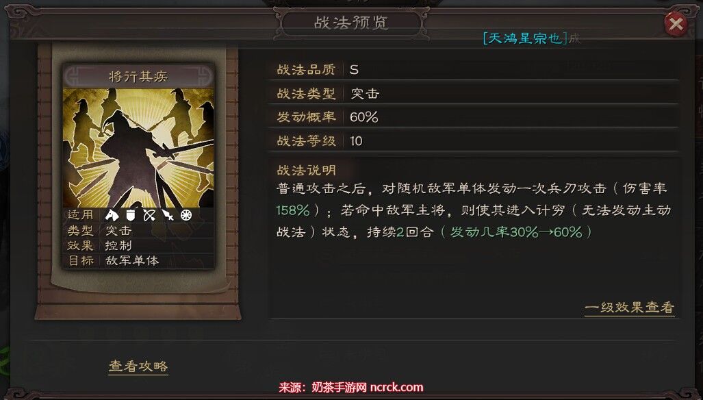这是一个高伤害的准备类主动战法,非常适合与甘宁、黄忠等弓兵专属武将配合使用。因此,它更适合于以兵刃输出为主的队伍。