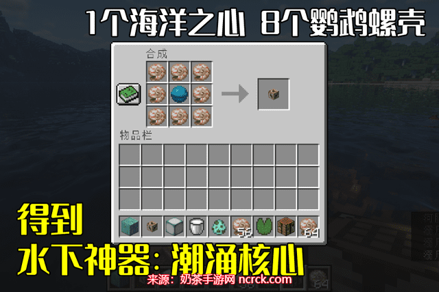 2、合成潮涌核心: 在工作台中,将海洋之心放置在9宫格的中间位置,然后用8个鹦鹉螺壳将其包裹起来。这样,就可以合成一个潮涌核心。