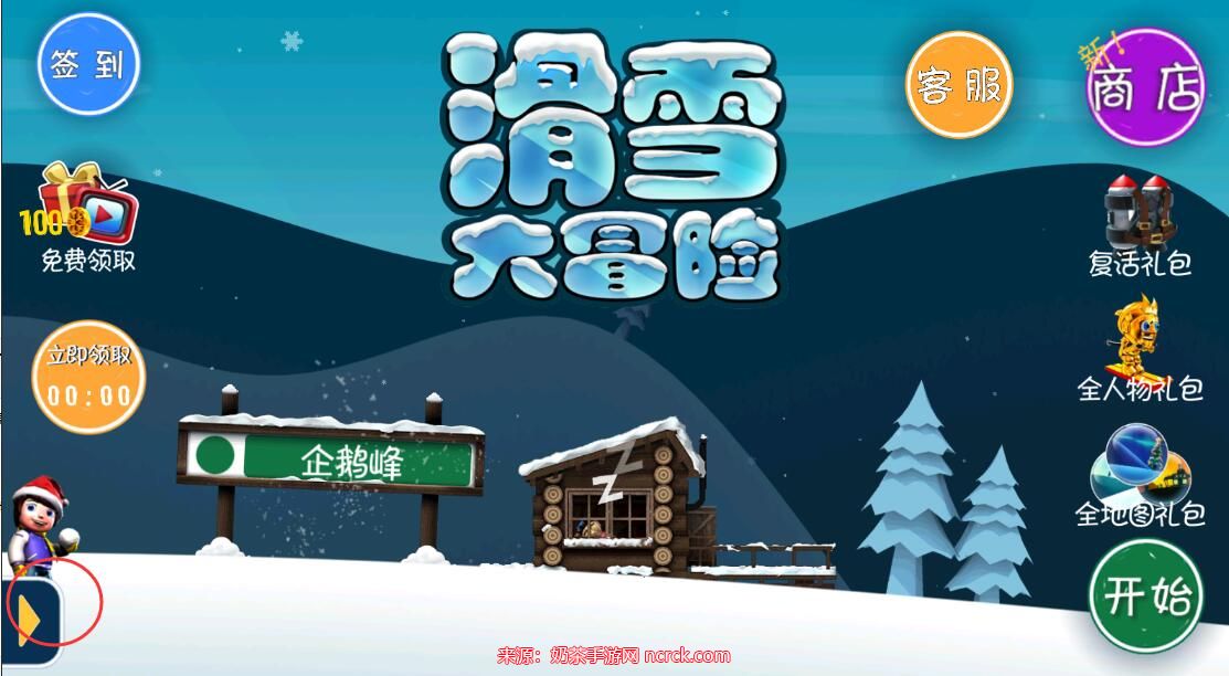 1、在滑雪大冒险游戏主界面,点击左下角的按钮,如下图所示: