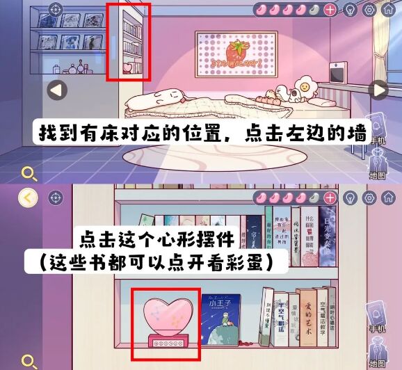 1、进入筱圆房间之后在,在床的左边方位有一个心形的摆件;