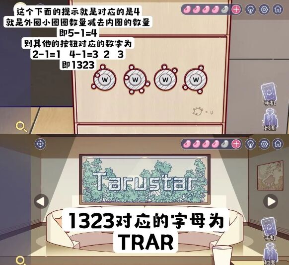 3、而数字对应的英文字母是客厅后边的画上,上面有一个英文单词(金牛座),而u=4,代表u是第四个字母,而1323对应的字母便是【TRAR】。