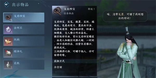 2、接着玩家需求去杂货铺购买文房四宝,之后找到宋乐词并出示给他并对话。