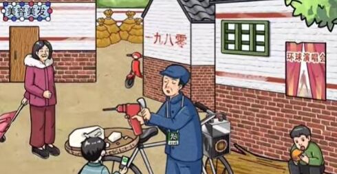 墙上贴着海报,女性穿戴羽绒服,手里拿着买菜车,卖糖的人穿戴老爹鞋,手里是电钻,小孩拿着手机付出。