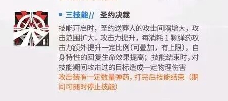 技能开启时,圣约送葬人的攻击间隔增大,攻击范围扩大,攻击力提升,每消耗1颗弹药攻击力额外提升一定比例(可叠加,有上限),自身特性的回复生命效果提高;技能结束时,对技能期间攻击过的目标造成一定物理伤害
