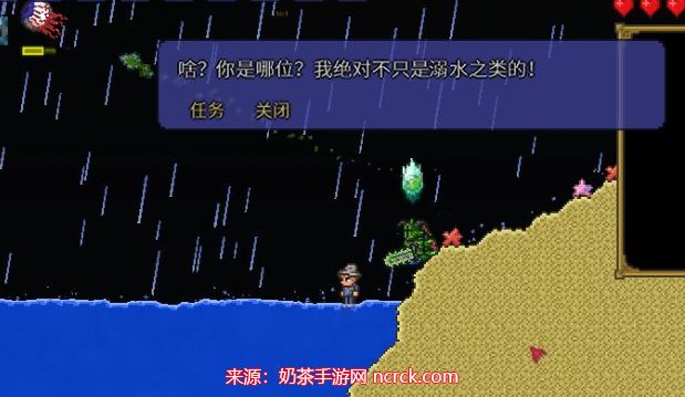 1、在海滩或其他水面上,会随机出现一个沉睡的渔夫。和其他被束缚的NPC一样,需要与他对话来激活任务。