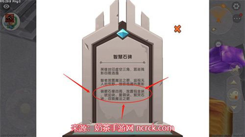 1、根据智慧石碑的提示,我们要在萌眼石像的四周放置四个石块。
