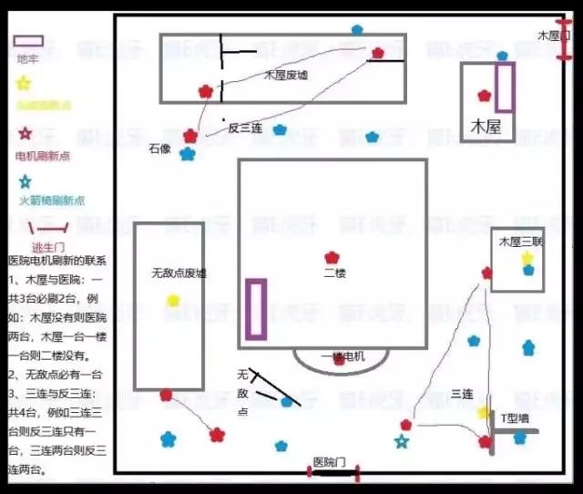 1.密码机:密码机全天地图共有11个刷新点,每场比赛刷新固定七个,求生者阵营需要破译其中5个,而后前往电闸输入密码来开启大门后逃生。密码机上面有天线,求生者们可以根据天线找到密码机的位置。(淡蓝色的辣个)