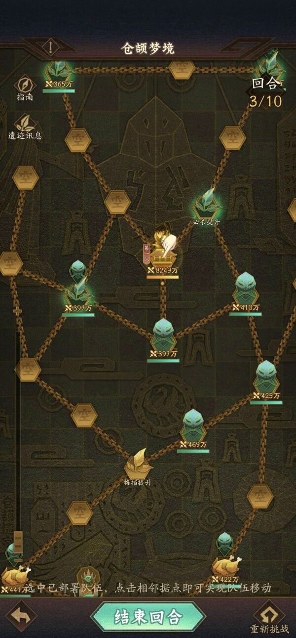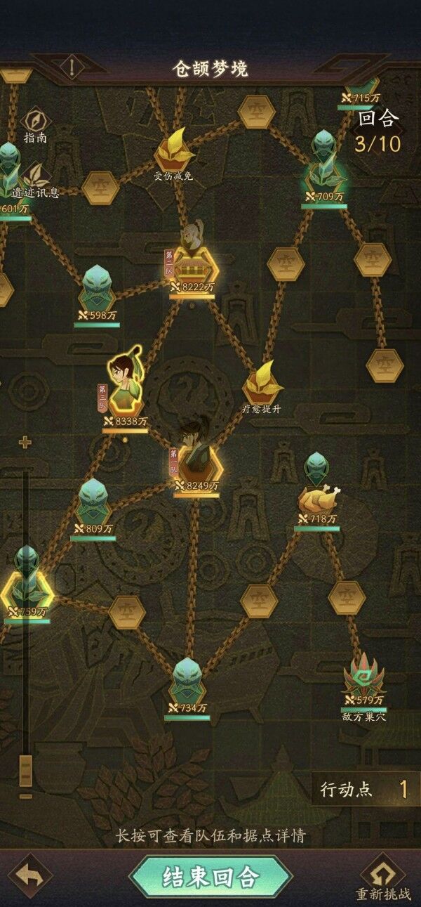 第三回合后:副队优先占领梦境增益遗迹,主队向上方进发直逼敌方巢穴,同时也会触发补给效果——丰盛的食物回复全体伙伴20%生命值供主队恢复状态,由于场上除敌方巢穴外不存在敌方势力,副队可以原地休整,多余的副队行动点可以不使用直接跳过。
