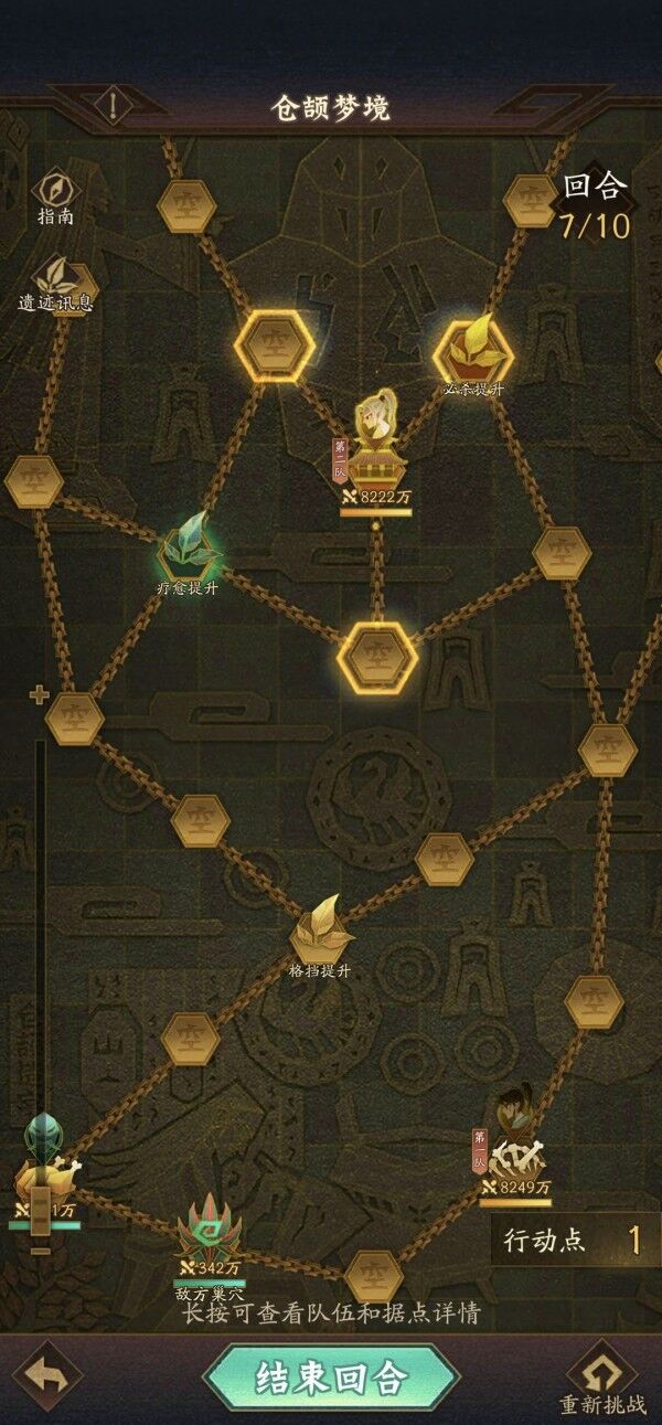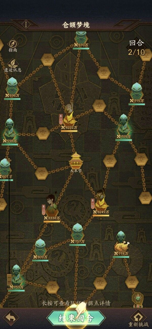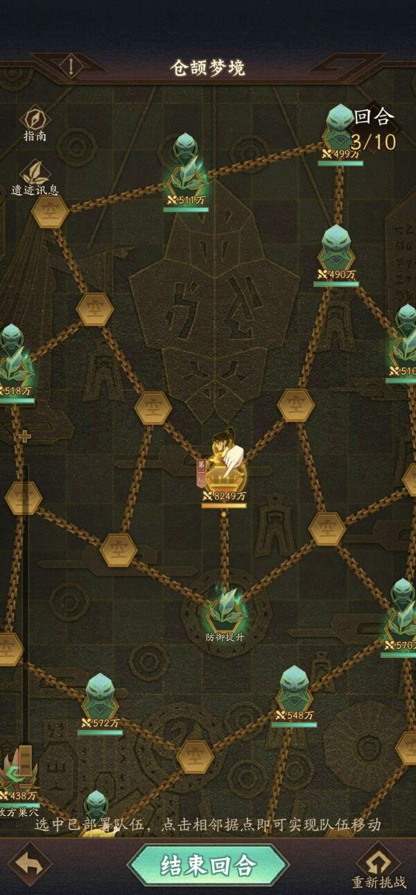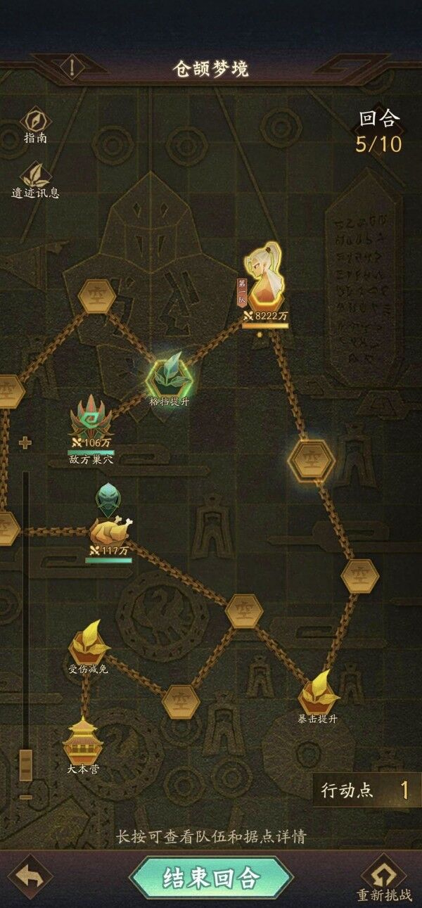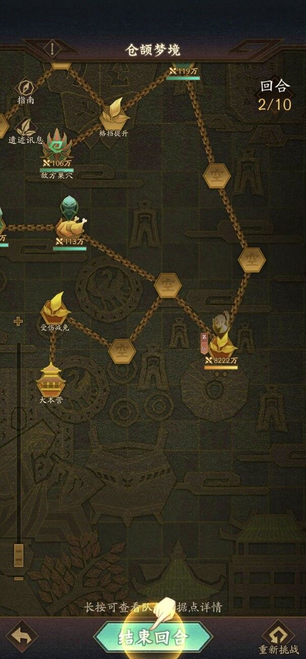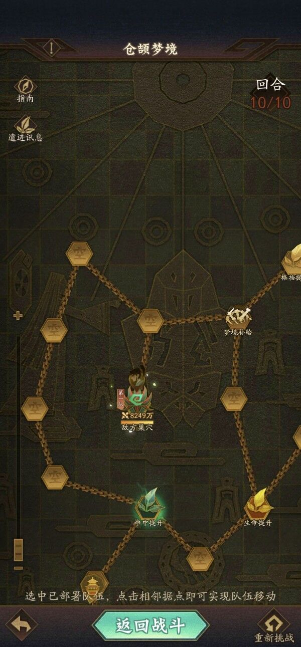 第二回合后:主队从右侧一路高歌猛进,副队在左侧不动如山,占领暴击提升梦境遗迹后继续镇守大本营。若主队状态保持在高位,可不领取梦境补给直捣巢穴,避免一场战斗。