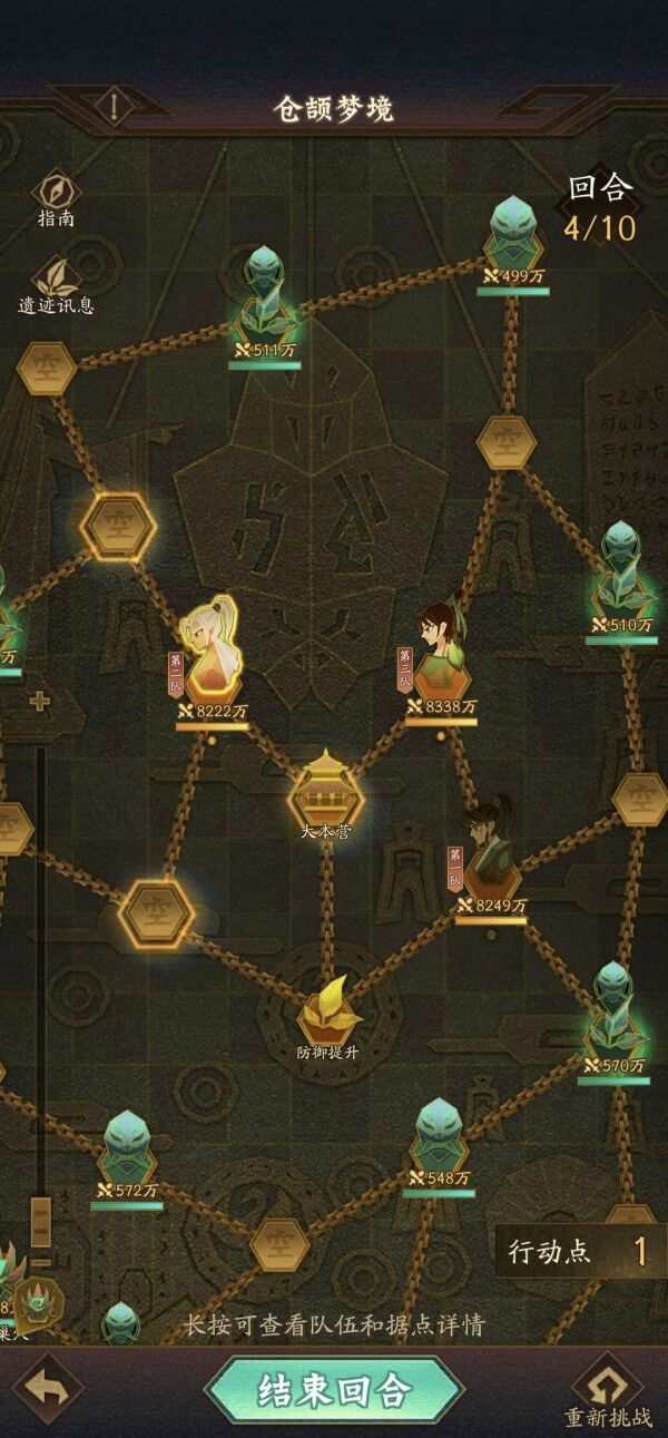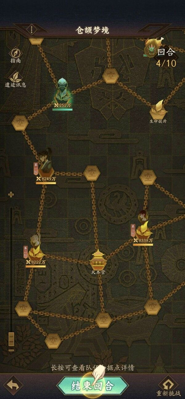 第四回合以后:副队若有余力可主动向左上或右上进军占领生命防御提升的遗迹节点,留1队据守大本营即可,主队继续前进捣毁敌方巢穴。