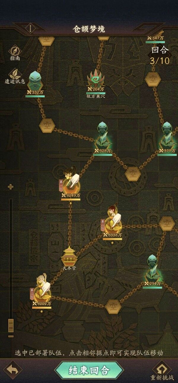 第一回合:主队向右进发解决大部分战斗,还能在梦境补给获得回复,副队驻守大本营左侧抵御来犯之敌即可。