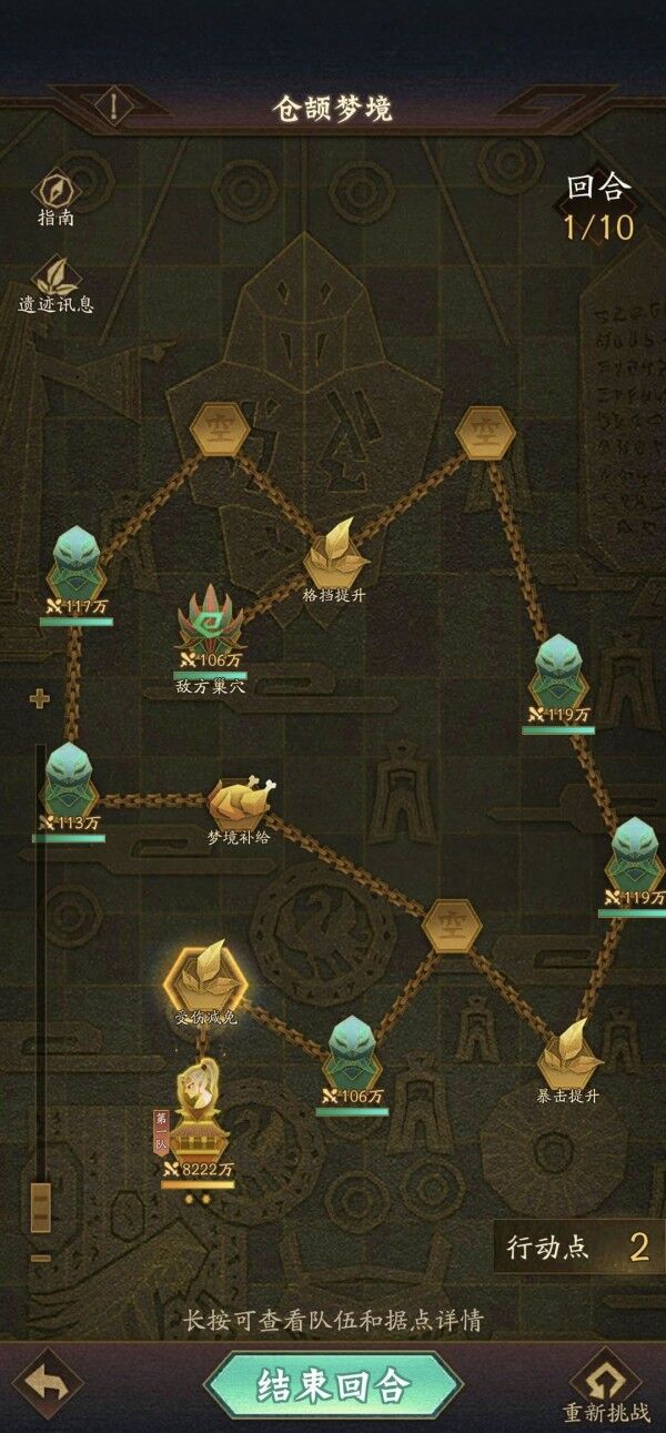 第一回合:沿着锁链向前进,领取“梦境遗迹”中的buff,助力更快通关,击败敌人后点击“结束回合”进入敌方轮次;