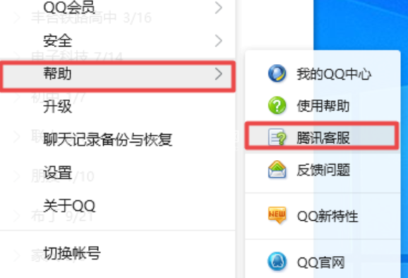 2、然后在弹出的选项中,选择【帮助】功能中的【腾讯客服】选项,并点击。