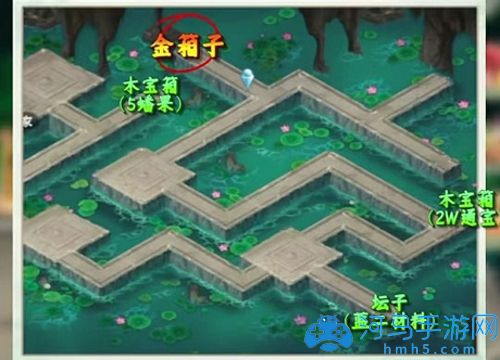 来到扬州城,打开小地图,找到姬三娘家,来到她门口的那口井,进入就来到了井底迷宫,图中所示有一个金箱子(玄月闪、菩提果*9),和两个木箱子,大家照着找一下即可。