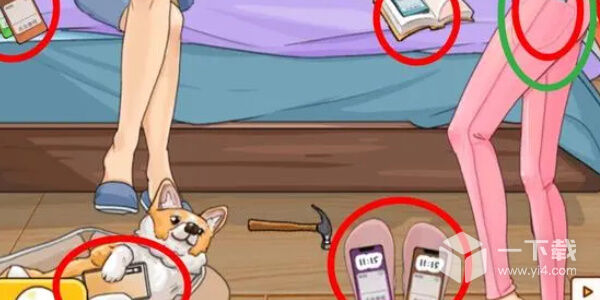 1、进入游戏我们需要找出房间里藏起来的手机,分别点击点击左下角的狗子;点击床上的书本;