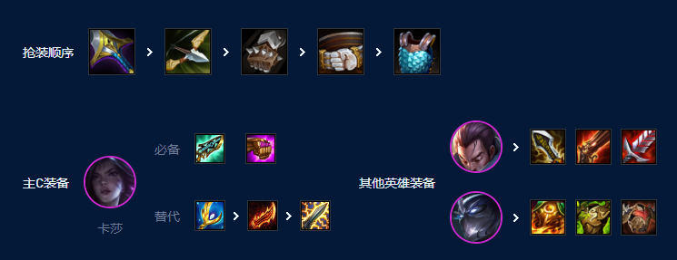 装备优先卡莎的科技枪和慎的肉装,这套阵容核心的思路就是卡莎的科技枪配合6艾欧慎的减伤,可以让慎坚毅不倒。亚索装备随缘,有火炮无尽的话直接化身后排去质器,即使没有,出泰坦、夜刃这类战士装也不错。