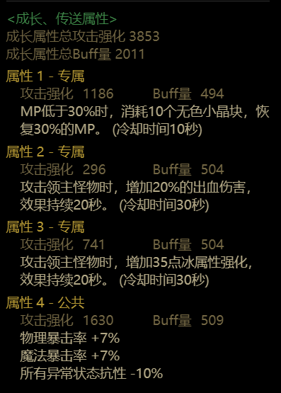 辅助装备恩特精灵圣杯可根据减伤魔法石对应属性选择必带属性抗性,其余3词条推荐为回避率,暴击率+7%,所有属性强化+15;深潜迷航腕表除必带连击3次+3%回避率外,推荐其余3词条为每30秒加速,每30秒减伤,回避率8%。