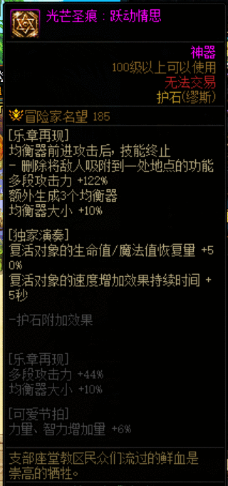 增加了复活对象的生命值、魔法值恢复量,增加了复活对象的速度增加效果持续时间,实际体验聊胜于无,护石效果优先度低,不推荐使用。