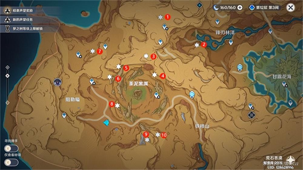 第十处:传送到荒石苍漠七天神像,然后往西南方向前进,爬上悬崖后即可看到。