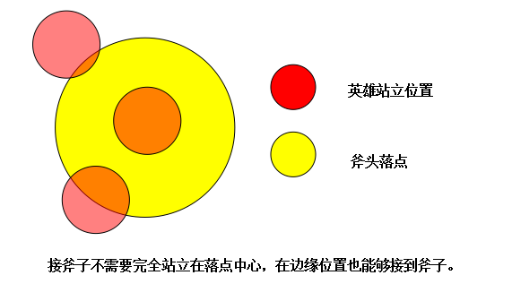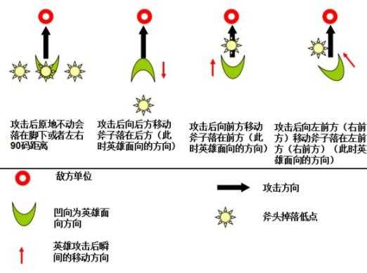 德莱文的斧子掉落点是有规律的。如果站着不动,斧子扔出去会弹回来并落在你脚下或左右100码以内的距离(不会落向身后)。但若斧子扔出去时未打到敌人而你进行了移动,那么斧子会落向你当前移动的方向前方大约400码的位置。为了更好地理解这一点,小编为大家准备了如下图所示的图解: