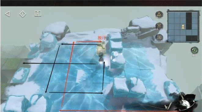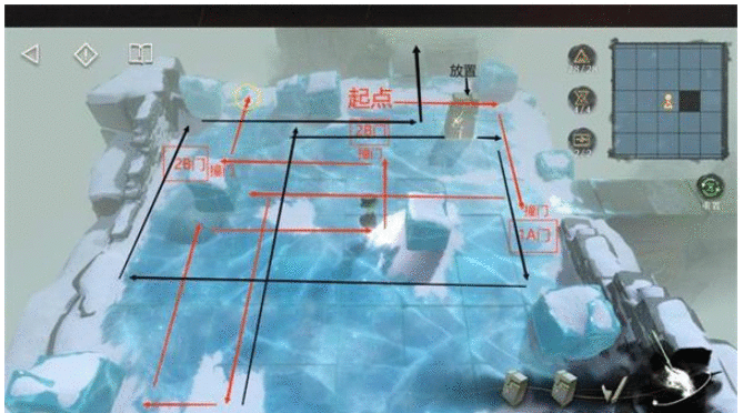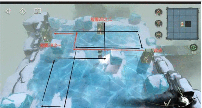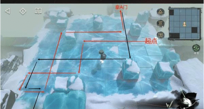 7.图3的线比较多,做图做错了orz只能把门的位置标注上,不用担心,只要门是按照上一张图摆的,跟着路线走,都会撞门以示正确。走完图3的红线拿完奖励,把两扇B门回收,右边路口的A门不要动,借由它到右边拿到刷新的B门后,再回收A门。然后回到下方重新拿刷新的A门。所以黑线的起点从下方雪区开始,这时我们有三扇门,跟着黑线放置一扇门,用剩下两扇门去开机关。