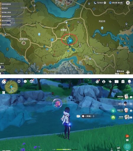 1、玩家打开地图来到蒙德清泉镇的传送点处,来到对面湖边能够看到有一个互动键,这就是第三个彩蛋。