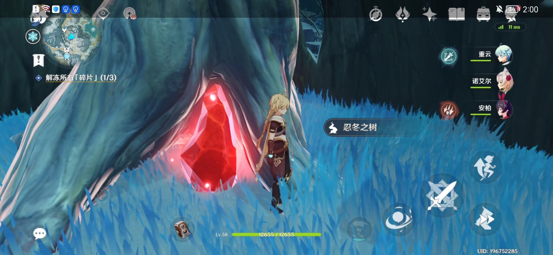 想要通往雪山山顶必须解冻三块冰封碎片,想要将其解锁就要先将红色石头打破,用红色buff对碎片进行四次攻击。值得注意的是,在红色buff攻击碎片后,不会刷新,各地区的红色buff在离开一定范围后自动解除。所以,每块碎片旁边都有对应且唯一的四块红石用于解封。
