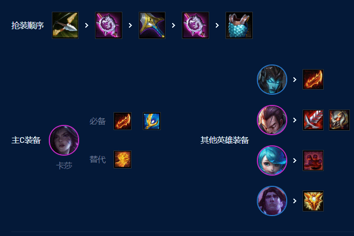 4、卡莎最好有豪华的装备来保证阵容在前15秒内打出减员或者压血线,帮助滑板鞋过第一个前排。
