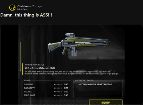 日前,《地狱潜者2》最新通行证“民主爆破”战争债券正式发布,其中推出了多种新步枪、爆燃弩以及新次要武器以及实用强化资源。然而,其中一把名为BR-14“审判者”步枪的武器却遭到了玩家们的疯狂吐槽。