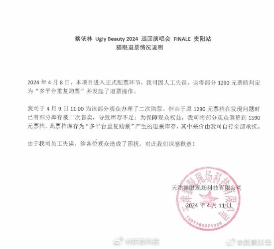 4月11日傍晚,猫眼发布《蔡依林 Ugly Beauty 2024巡回演唱会 FINALE 贵阳站猫眼退票情况说明》,承认出现人工失误,在4月8日误将部分1290元票档判定为“多平台重复购票”并发起了退票操作。4月9日11:00,猫眼为该部分观众办理了二次购票。但由于原1290元票档在发现问题时已有部分库存被二次售卖,导致库存不足;为保障观众权益,猫眼将部分观众调整到1590元票档,此票档库存为“多平台重复购票”产生的退票库存,其中差价由猫眼自行全部承担。“由于我司员工失误,给各位观众造成了困扰,对此我们深感歉意!”