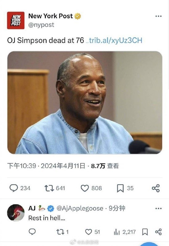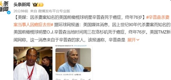 据头条新闻报道,美国媒体消息,因上世纪90年代杀妻案而知名的美国前橄榄球明星O.J.辛普森当地时间周三在洛杉矶死于癌症,终年76岁。