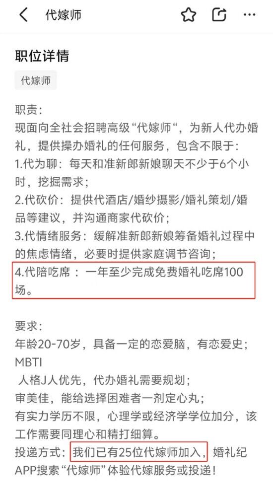据了解,该公司已有25位代嫁师,有网友晒出和代嫁师聊天记录。网友:带薪吃席?