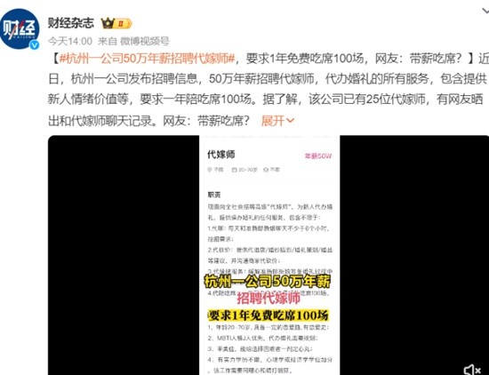 杭州一公司50万年薪招聘"代嫁师" 要求1年免费吃席100场