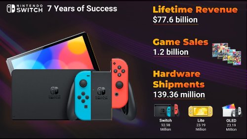 Nintendo Switch生涯周期内收入 776亿美元,游戏销售 12亿,出货量1.3936亿,其中Switch标准版(包括续航版)售出9298万台,Lite版2319万,OLED版2319万。
