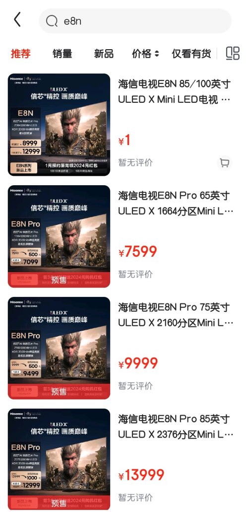 海信电视于昨日正式公开了E8系列电视,并和《黑神话:悟空》进行了联名,而目前,在海信官方旗舰店上,该系列电视已经开启预定及预售,4月30日晚20:00支付尾款.