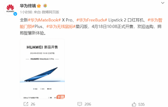华为终端宣布,全新华为MateBook X Pro、华为FreeBuds Lipstick 2 口红耳机、华为智能门锁Plus、华为无线鼠标星闪版,将于4月18日10:08正式开售。在官宣中,华为并未提到Pura 70或其他任何手机系列。