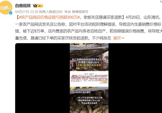 据白鹿视频报道,近日,山东潍坊,一家农产品网店发关店公告称,因对平台活动规则理解错误,导致店内生姜销售价格标错,被下近8万单。