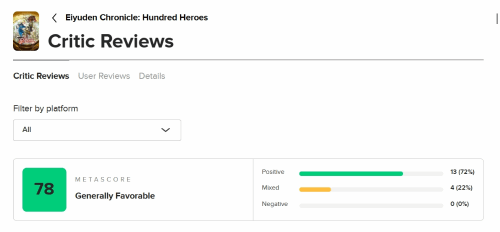 《百英雄传》媒体评测已经正式解禁,目前该游戏在M站共收录有17家媒体评分,其中好评13,中评4,均分78分。另外IGN为本作打出了7分,IGN日本则给出了9分的高分。