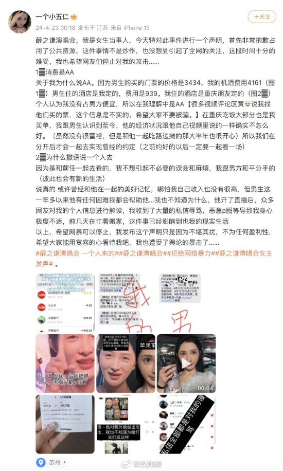 4月23日凌晨,薛之谦演唱会事件女主@一个小五仁发文称该事件并非炒作,并回应为什么撒谎说一个人去。