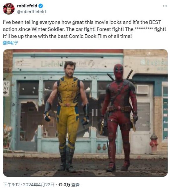 “我一直在告诉大家这部电影看起来有多棒,这是自《冬日战士》以来最好的动作片。汽车战!森林战!**********战!这些将与有史以来最好的漫画电影一同亮相!”