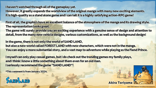 鸟山明还对游戏的视觉效果赞赏有加,称其“很好地平衡了漫画的氛围和绘画风格。表现力看起来很棒”,并喜欢游戏中 “真正的设计感和对细节的关注”。最后他还表示非常推荐各位玩家尝试《沙漠大冒险》这款游戏。
