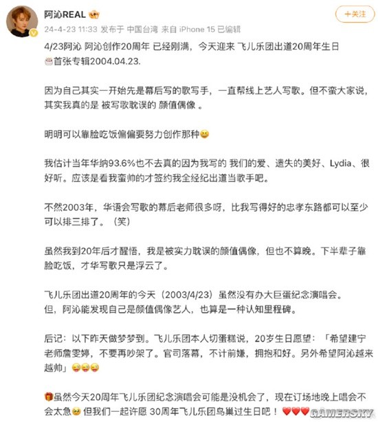 成员阿沁发文纪念飞儿乐团出道20周年,透露昨天梦到飞儿乐团切蛋糕,还许下了30周年飞儿乐团鸟巢过生日的愿望。