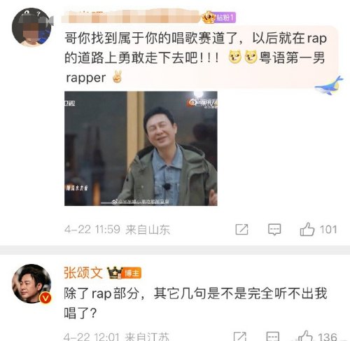 随后,有网友在张颂文微博评论区留言调侃:“哥你找到属于你的唱歌赛道了,以后就在rap的道路上勇敢走下去吧!粤语第一男rapper”,张颂文回复该评论称:“除了rap部分,其它几句是不是完全听不出我唱了”。
