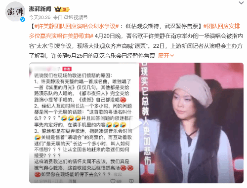澎湃新闻消息,4月20日晚,著名歌手许美静在南京举办的一场演唱会被指内容“太水”引发争议,现场大批观众齐声高喊“退票”。