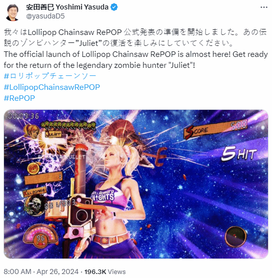 《电锯糖心:RePOP》游戏总监安田善巳近期发推透露,他们正在为游戏的发售做准备,请期待传奇僵尸猎手朱丽叶的回归。