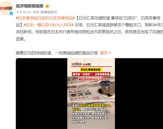 日本一颗白菜近100元人民币 日元汇率刷新34年来新低
