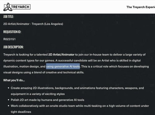 CharlieIntel在Twitter上发布的招聘信息中直接指出:“Treyarch正在寻找一位才华横溢的2D艺术家/动画师加入我们的内部团队,为我们的游戏提供各种各样的动态内容类型。成功的候选人将是一位擅长数字插图、动画设计以及使用生成式人工智能工具的艺术家。”