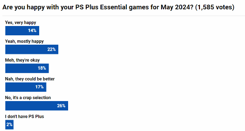 外媒pushsquare发起玩家满意度投票调查,截至发稿共1,585人参与:有14%的玩家表示非常满意,22%玩家表示对大部分游戏满意;18%的玩家仅表示中规中矩;17%玩家认为新增会免质量应该更好;26%玩家认为这四款游戏都太差了。