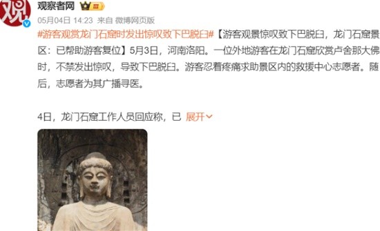 游客观景龙门石窟惊叹致下巴脱臼 景区:已帮助复位